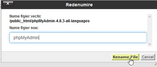 - un nouveau répertoire avec le nom de l'archive respective, mais sans l'extension .zip, apparaîtra dans le répertoire public_html. Ce répertoire doit être renommé pour qu'il ne reste que "phpMyAdmin". Le renaming se fait en sélectionnant le répertoire en question et en appuyant sur le bouton "Renommer" dans la barre en haut de la page.