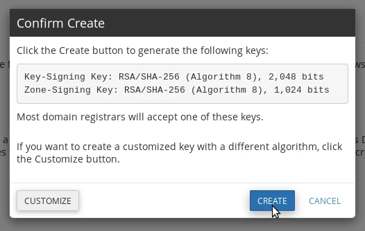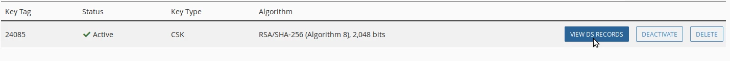 - Dans la fenêtre suivante, nous trouverons les clés nécessaires pour configurer DNSSEC dans le panneau du registraire.