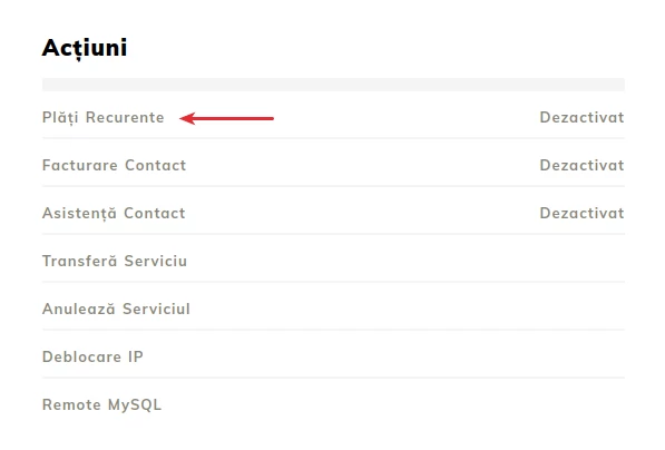 - La section Services affiche les forfaits d'hébergement actifs. Cliquez sur le service pour lequel vous souhaitez activer les paiements récurrents, et la page de gestion du service s'ouvrira. Dans la fenêtre de gestion, sous la section Actions, l'option d'activer les paiements récurrents est disponible.