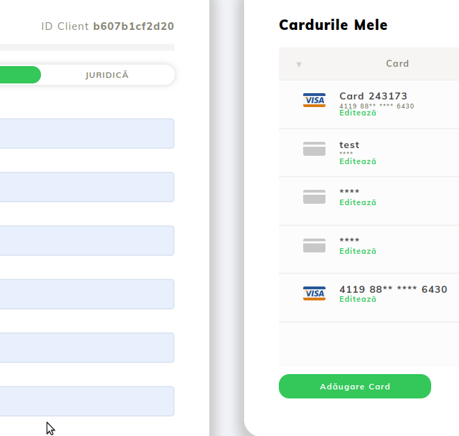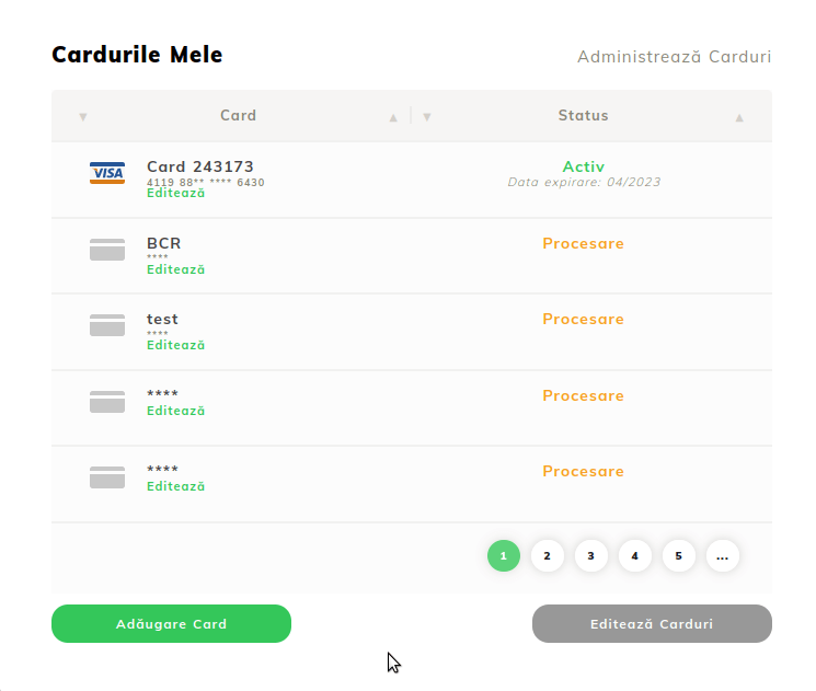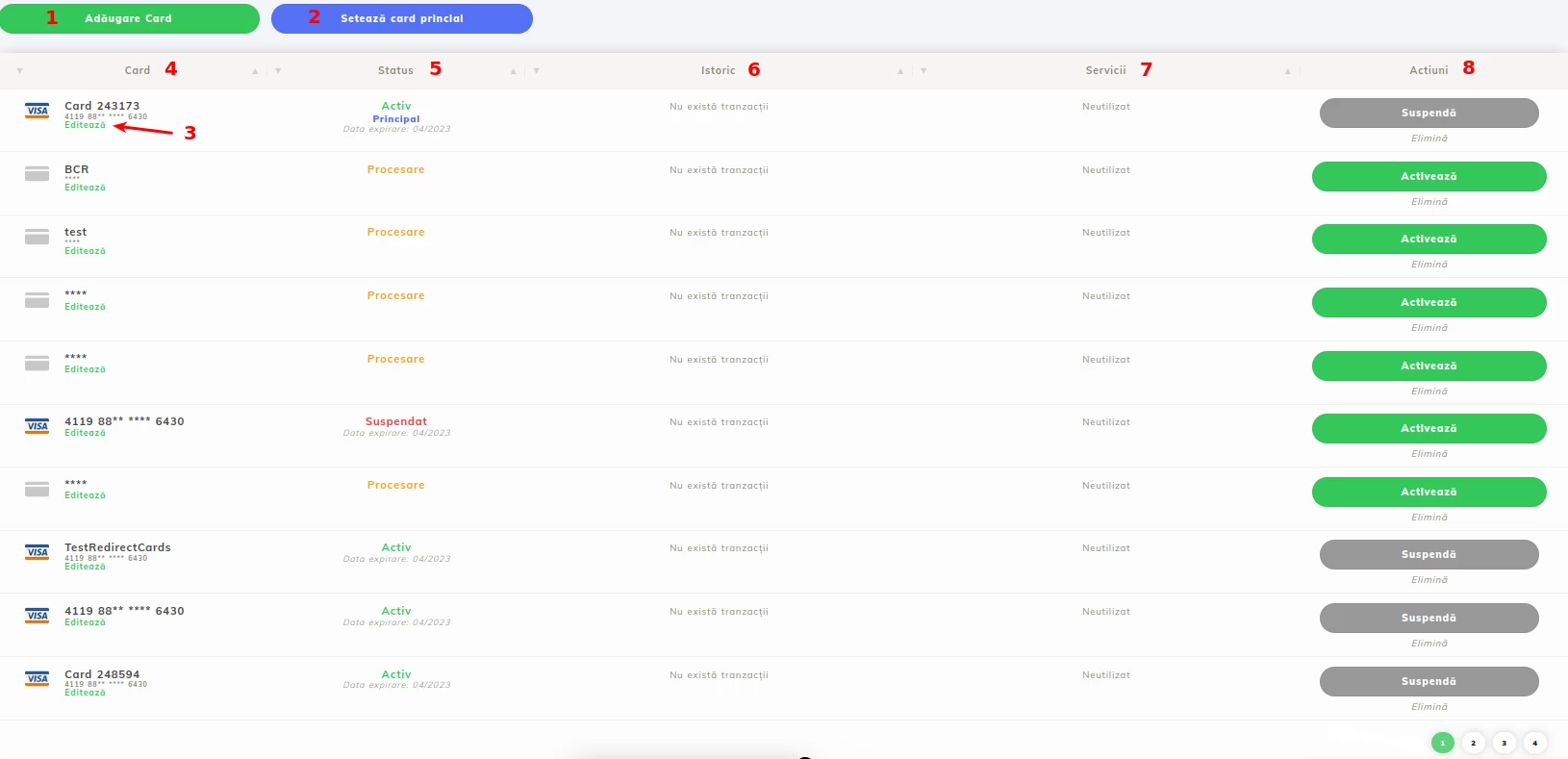- Nous maintenons la fenêtre ouverte (Utilisateur -> Lien utilisateur), et nous redirigeons notre attention à nouveau vers la section Mes cartes. Vous remarquerez que la carte ajoutée précédemment est présente dans le tableau et a un statut actif. Cela signifie que la banque a validé avec succès la demande d'ajout et que la carte peut être utilisée pour effectuer des paiements.