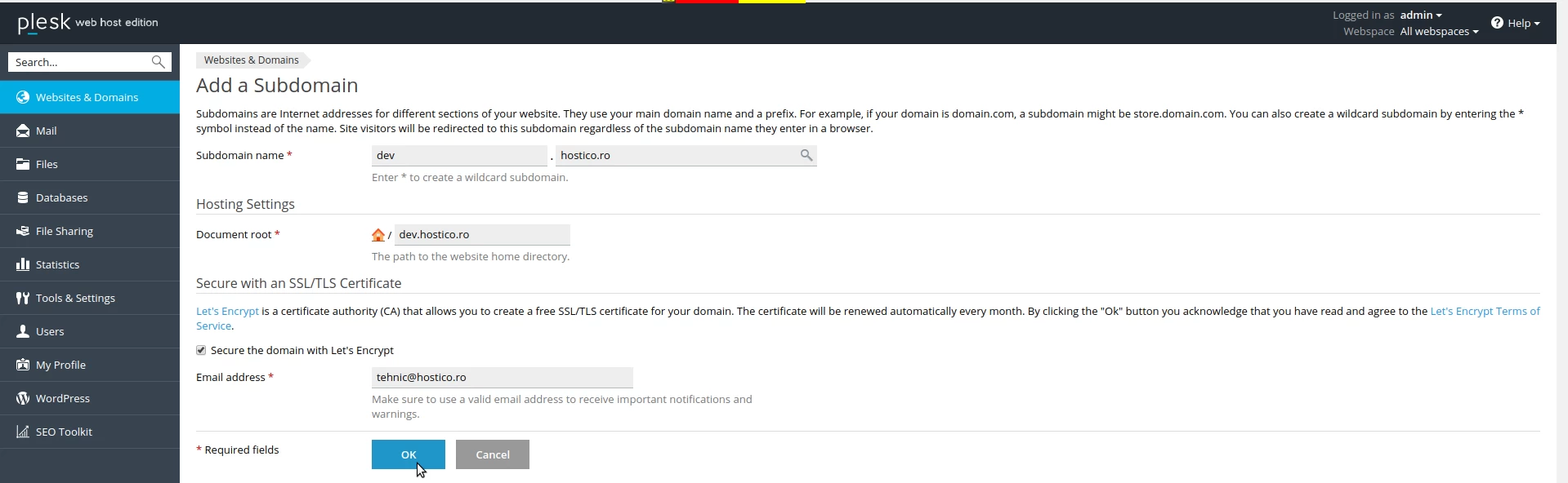- Ici, nous pouvons définir le chemin pour les fichiers, Document root et sécuriser le sous-domaine grâce à Let's Encrypt.