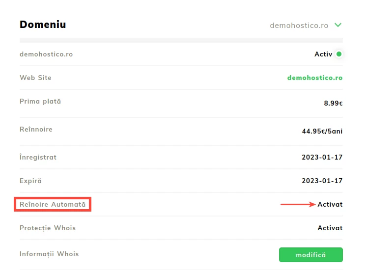 Dans le menu ouvert, dans la section Renouvellement Automatique, cliquez sur le statut „Activé” pour le modifier;