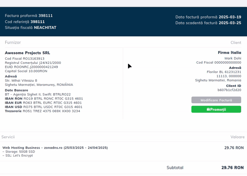 Connectez-vous à votre compte client Hostico et accédez à la section Financier. Ouvrez la facture pro forma sur laquelle vous souhaitez appliquer le coupon.