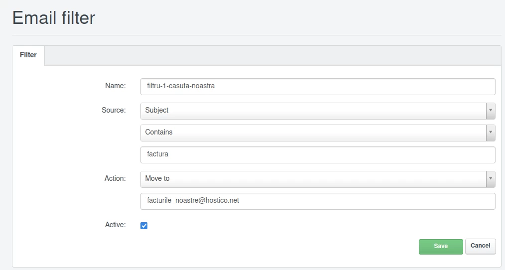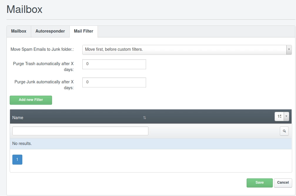 Dans l'onglet Filtre de courrier, nous pouvons définir des filtres supplémentaires personnalisables pour les messages électroniques envoyés à la boîte aux lettres, qui s'exécuteront automatiquement avant qu'ils n'entrent dans la boîte de réception, effectuant diverses actions configurables depuis le bouton Ajouter un nouveau filtre.