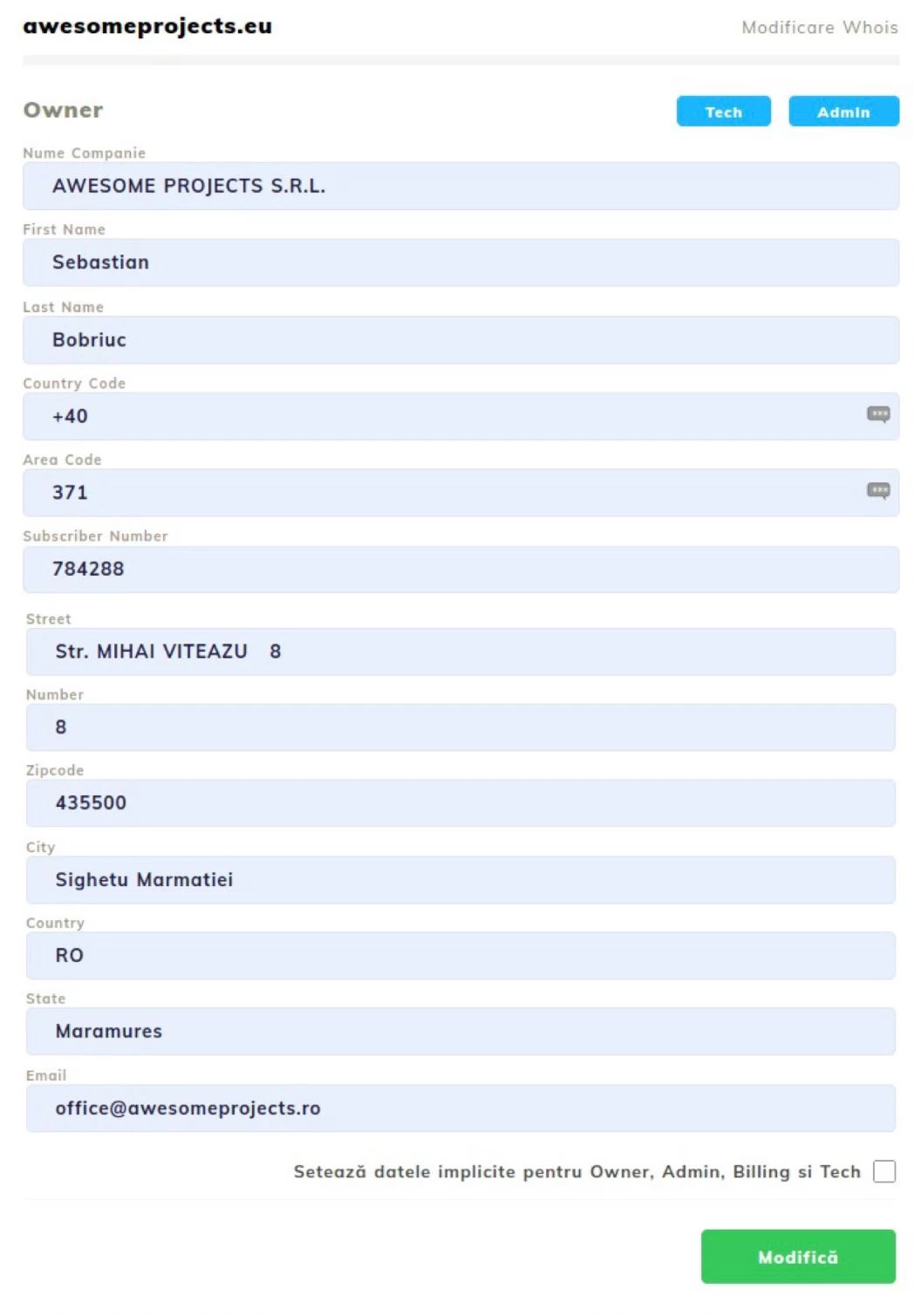 - Modifier les données du titulaire au niveau du domaine ne mènera pas automatiquement à la mise à jour des données de facturation. Pour modifier la facturation, vous devrez suivre les étapes du tutoriel correspondant : Modification de la facture pro forma ;