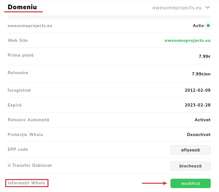 Après avoir accédé au domaine, dans la nouvelle page ouverte, nous accéderons à la section Domaine;- Dans cette section, la section Informations WHOIS est d'un intérêt particulier