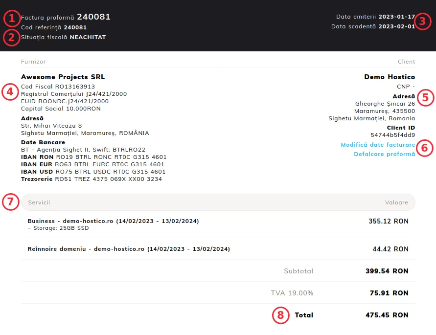 1. Numéro de facture - le numéro de la proforma générée est présenté ;