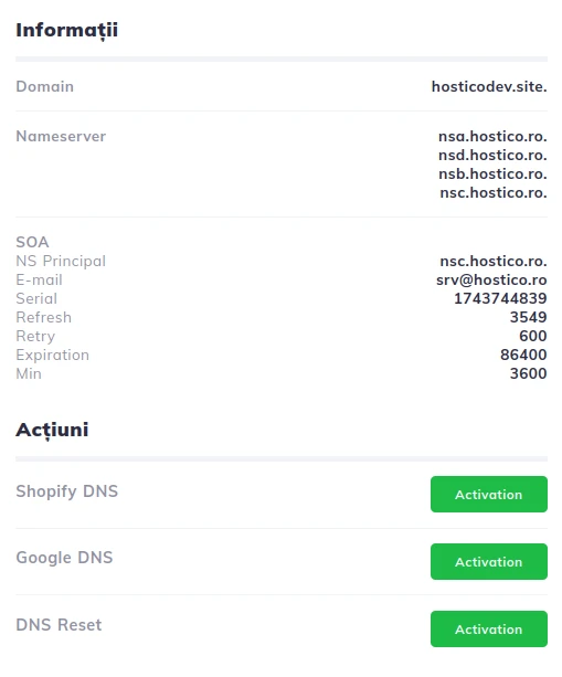 À droite de l'écran se trouve une fenêtre dédiée à l'affichage des informations générales concernant les paramètres DNS actifs pour le domaine. Dans le cas où vous souhaitez rediriger la zone DNS vers une plateforme externe, telle que Shopify ou Google, cela peut être réalisé facilement via le menu d'actions disponible dans l'interface.
