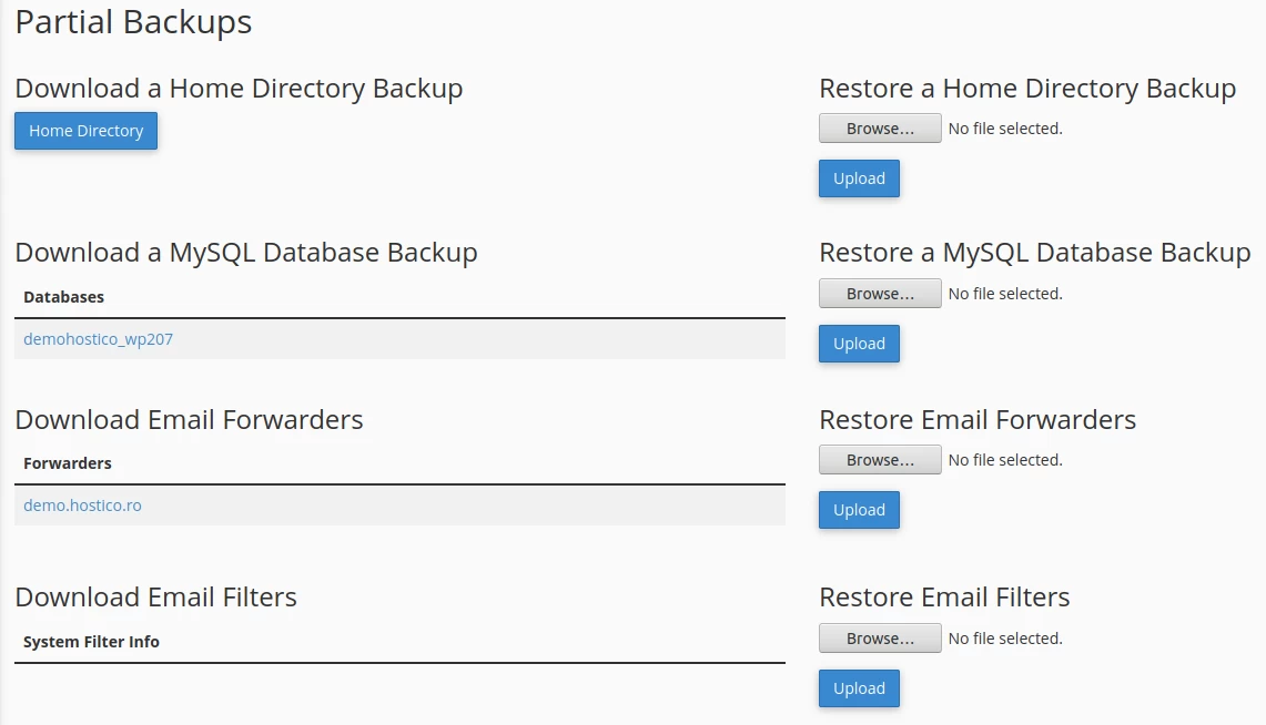 • Cette option créera une archive avec tous les fichiers et paramètres du compte à sauvegarder, mais à partir de l'interface cPanel, cette archive ne peut pas être utilisée pour une restauration complète d'un site. Pour une restauration complète, vous devrez nous contacter par e-mail à : help@hostico.com